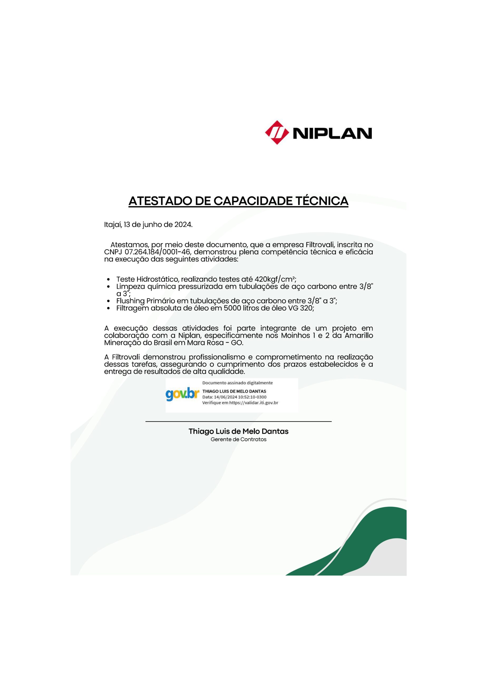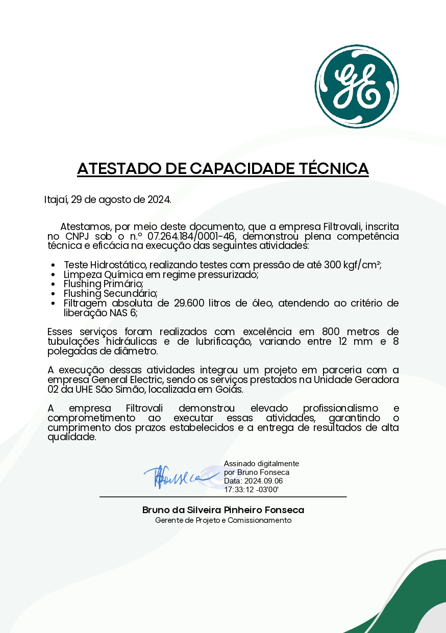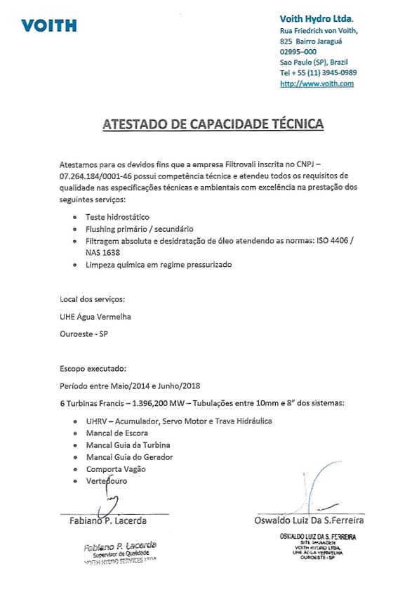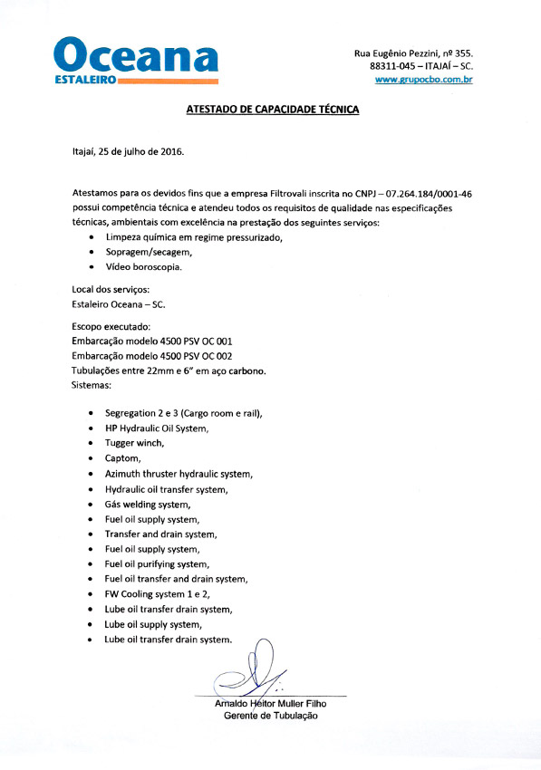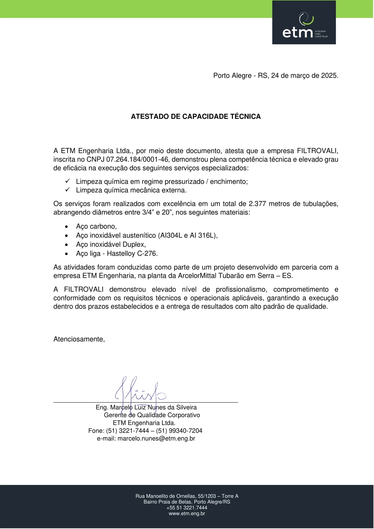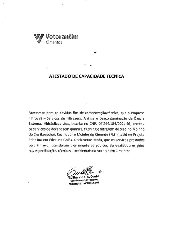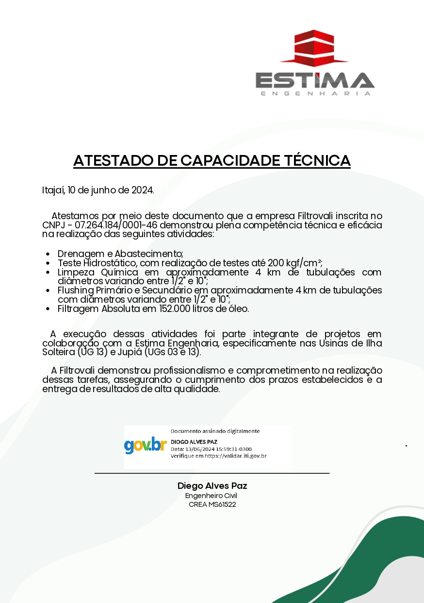 Confira os atestados de capacidade técnica da Filtrovali, que comprovam nossa proficiência em todas as áreas que atuamos.